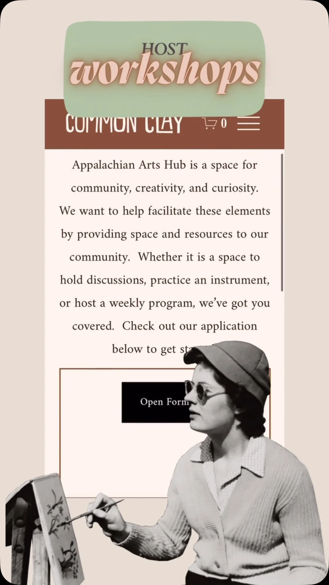 Appalachian Arts Hub (AAH) is a subsidiary to our pottery, holding space for various workshops of all manner of medium and focus, continuing education classes, events, and as a third space for anyone seeking the elbow room to get creative and make a mess or a masterpiece.